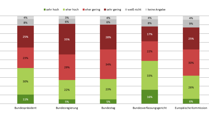 Von den abgefragten Institutionen haben die Umfrageteilnehmer nur in das Bundesverfassungsgericht mehrheitlich ein hohes Vertrauen (49 %; kumuliert). Bei den anderen Institutionen überwiegt jeweils der Anteil derer, welche nur wenig Vertrauen haben, wobei diese Anteile zwischen 46 Prozent (Bundesamt für Verfassungsschutz) und 64 Prozent (Bundesregierung) rangieren (je kumuliert). Dies schlägt sich entsprechend auch bei den einzelnen Skalenpunkten nieder: Am häufigsten haben die Befragten in das Bundesverfassungsgericht sehr hohes (16 zu 5 – 11 %) und eher hohes Vertrauen (33 zu 22 – 31 %). Eher geringes Vertrauen haben die Umfrageteilnehmer am häufigsten in den Bundestag (34 zu 22 – 30 %) und sehr geringes Vertrauen am häufigsten in die Bundesregierung (35 zu 17 – 32 %). Zwischen sechs und neun Prozent können und drei bzw. vier Prozent wollen dazu keine Einschätzung äußern.