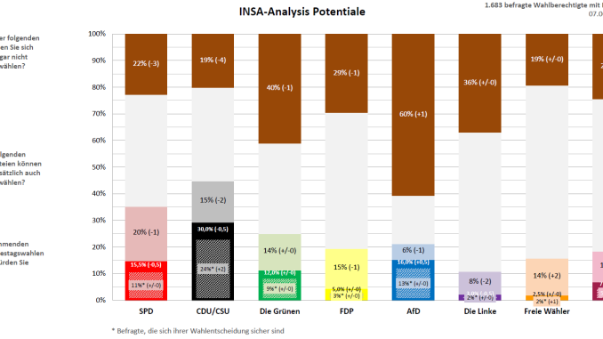 Bei den potentiellen Wählern können sowohl die Freien Wähler als auch das BSW jeweils zwei Prozentpunkte zulegen. Die SPD, die FDP sowie die AfD verlieren hier hingegen jeweils einen und die Union sowie die Linkspartei jeweils zwei Prozentpunkte. Einzig das Potential der Grünen bleibt konstant.