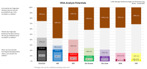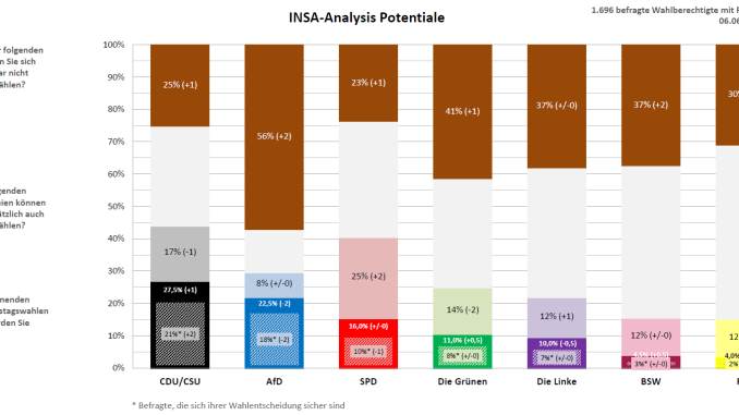 Die Linke gewinnt bei den potentiell erreichbaren Wählern einen und die SPD zwei Prozentpunkte hinzu, wohingegen die Union sowie die FDP hier jeweils einen und die Grünen zwei Prozentpunkte verlieren. Die Potentiale der AfD sowie des BSW verändern sich nicht.