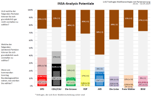Den Anteil an potentiellen Wählern kann sowohl die Union als auch die FDP jeweils um einen Prozentpunkt und die Grünen um zwei Prozentpunkte erhöhen. Die AfD sowie das BSW verlieren hingegen jeweils einen Prozentpunkt. Die Potentiale der restlichen Parteien verändern sich jeweils nicht.