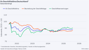 Die Stimmung unter den Unternehmen in Deutschland hat sich verbessert. Der ifo Geschäftsklimaindex stieg im Februar auf 88,6 Punkte, nach 87,6 im Januar. Die Unternehmen zeigten sich zufriedener mit ihren laufenden Geschäften. Auch die Erwartungen hellten sich auf. Die deutsche Wirtschaft zeigt erste Signale einer Belebung.