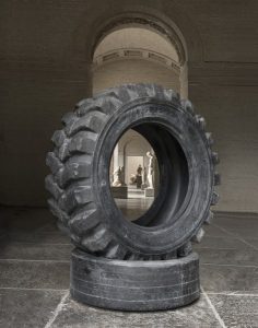 Vor Rätsel steht der Betrachter immer wieder auch bei der Identifizierung der Materialien, woraus die Skulpturen geschaffen sind. Weißer und schwarzer Marmorstein wird in weitaus ärmeren Materialen optisch umgewandelt und vollzieht eine vorbildhafte Täuschung, die die Wahrnehmung verändert. „La Suprema“ als Remake einer vergilbten Obsttransportkiste aus Holz, „Aereo“ ein eleganter Riesenpapierflieger, „Stragate“, eine in ihrer Verzierung orientalisch anmutende, überdimensionierte Plastikkiste, „Door Release“, eine Nachbildung in Styroporoptik von „Konstantins Hand“ sind vollwertige Nachahmungen von Objekten, die aus schlichteren, vor allem leichteren Materialien bestanden, welche sich vom edlen Marmor an erster Stelle durch ihr Gewicht – oder ihre Gewichtung! – unterscheiden. Die Ähnlichkeit zwischen Original und Nachahmung verblüfft, verwirrt, zwingt dazu, alles in Frage zu stellen. Es geht schlussendlich nur um den Bedeutungswechsel an sich, der die Vieldeutigkeit der Werke, deren komplexe Ambiguität in den Mittelpunkt rücken lässt. All die rigoros aus Marmor realisierten Exponate sind nicht nur faszinierende Blickfänge, sondern vordergründig einzelne, phantastische Elemente einer Inszenierung, die in der Glyptothek ihre perfekte Bühne gefunden hat. Wie die vollkommen imitierten, mal neuen, mal gebrauchten, übergroßen Reifen aus schwarzem Marmor, die sich einfühlsam in die Architektur des Bauwerks inmitten von Isar-Athen einfügen und ein harmonisches Ganze mit ihr bilden.