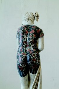 Überarbeitete Repliken klassischer Originale gesellen sich unter den Exponaten der Dauerausstellung zu Objekten des täglichen Gebrauchs, die ihrer gewöhnlichen Funktion entledigt wurden. Eine ästhetisch ansprechende Tätowierung aus Farbpigmenten umhüllt wie eine Arabesque den marmornen Rücken der Kopie der „Venus Italica“ und verwandelt die Göttin der Liebe in eine hochmoderne, beinah witzige Frauengestalt. Eine andere Tätowierung reproduziert ein Detail aus dem vor einiger Zeit in Italien in die Schlagzeilen geratenen, von Dantes „Höllensphären“ inspirierten Fresko „Inferno“ von Giovanni da Modena, das seit dem 15. Jht. in Bologna in der Basilika San Petronio zu sehen ist. Die farbige Tätowierung ist eine Darstellung des in der Hölle von Dämonen gequälten und von Flammen umzingelten Propheten Mohamed. Die Tätowierung dehnt sich um den schmerzhaft verkrampften Körper der zentralen Figur aus der berühmten Laokoon-Gruppe aus, die aus göttlichem Befehl dem Würgegriff der Schlangen ausgesetzt ist. Die Skulptur, die die Besucher der Schau vor dem Hauptportal empfängt, ist wohl eine mutige Provokation des Künstlers, der sich mit dem Thema des blinden Hasses auseinandersetzt, der aus einem giftigen Mix aus Vorurteilen und Verdächtigungen seit Jahrhunderten das friedliche Zusammenleben der Völker aufs Spiel setzt.