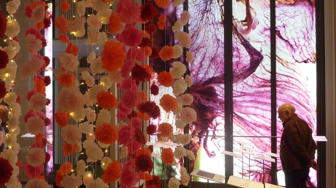 Den Textleser fordert die Ausstellung ganz schön. Wer nicht gern liest, geht wohl eh in eine solche Präsentation nicht rein. Wie auf wippenden Blütenstengeln liegen viele kurze Texte in jeweils wechselnden Schriftgrößen aus. Sie versuchen, die Vielfalt der uns umgebenden Natur einzufangen – aus der Sicht der Dichter. „Die Natur ist nützlich und gut, keineswegs entzückend“, erfährt man von Robert Walser, dem so ein Satz auf einem seiner Spaziergänge einfiel. Schon kriegt man ein bisschen Wind um die Ohren, die sich gerade am Entzückenden erfreuten. Hörten sie nicht ein Käuzchen rufen? Und erst die Augen: Sahen sie nicht gerade, dass es (künstlich!) Blumen an Schnüren vom Himmel regnet? Wie eines der hohen Fenster des Schauraumes mit einer leuchtend violetten Orchidee bemalt ist? Von oben bis unten. Gute Anregung für daheim …