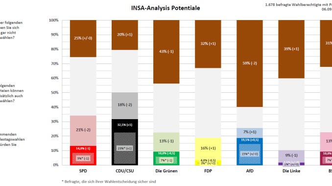 Den Anteil an potentiellen Wählern können in dieser Woche die FDP sowie die AfD jeweils um einen Prozentpunkt erhöhen, während die Grünen sowie die Linke jeweils einen, die SPD sowie die Union jeweils zwei und das BSW drei Prozentpunkte verliert.