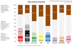 Den Anteil an potentiellen Wählern kann lediglich die FDP um einen Prozentpunkt erhöhen. Die Grünen sowie die AfD verlieren hier hingegen einen und sowohl die Linkspartei als auch das BSW jeweils zwei Prozentpunkte. Die Potentiale der übrigen Parteien bleiben jeweils konstant.