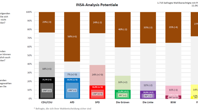 Den Anteil an ausschließenden Wählern kann die SPD, die Grünen, die Linke sowie die FDP jeweils um zwei, die CDU/CSU um drei und das BSW um vier Prozentpunkte verringern. Das Negativpotential der AfD erhöht sich indes um einen Prozentpunkt.