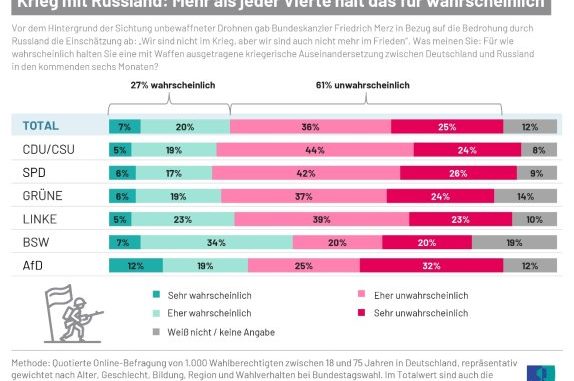 Unter den Parteianhängern der AfD befürchten 31 Prozent einen baldigen militärischen Konflikt mit Russland – eine knappe Mehrheit von 57 Prozent glaubt nicht daran. Allein bei der Wählerschaft des BSW halten sich Kriegsangst (41 % wahrscheinlich) und Optimismus (40 % unwahrscheinlich) etwa die Waage.