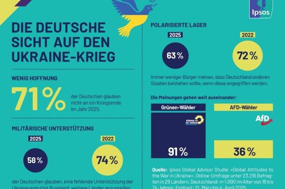 Die Ergebnisse stammen aus der Ipsos-Studie »Global Attitudes to the War in Ukraine«. Für die Online-Umfrage wurden zwischen dem 21. März und dem 4. April 2025 insgesamt 23.216 Personen in 29 Ländern über das Ipsos Online Panel System befragt. In Deutschland waren die Befragten zwischen 16 und 74 Jahre alt, die Stichprobe umfasste rund 1.000 Personen.