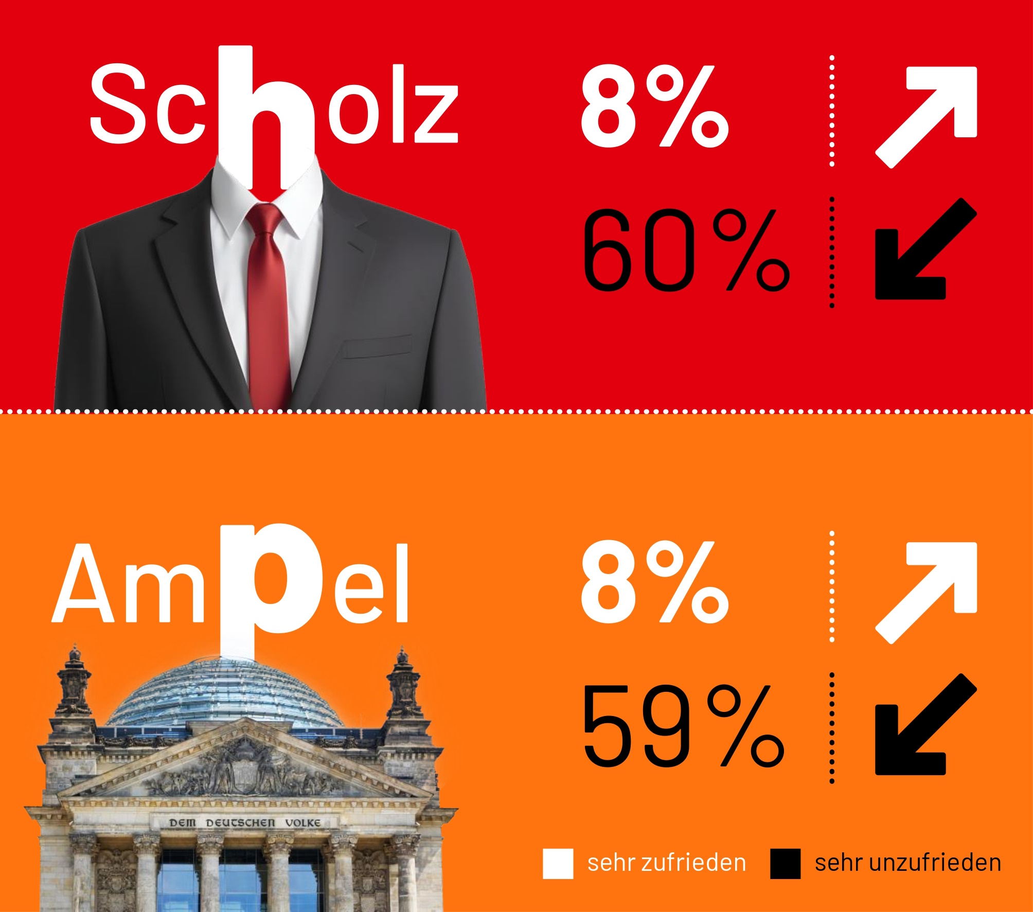 Im Vergleich zur letzten Erhebung Anfang November 2024 steigt die Netto-Zufriedenheit mit der rot-grünen Bundesregierung um fünf Punkte auf einen Wert von -51. Während sich 8 Prozent der Wahlberechtigten sehr zufrieden mit der Arbeit der aktuellen Regierung zeigen, äußern sich 59 Prozent der Befragten sehr unzufrieden.