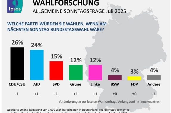 Konnten die Regierungsparteien im Vormonat noch in der Wählergunst zulegen, so verlieren sie im Juli wieder leicht an Rückhalt in der Bevölkerung. Im aktuellen Sonntagstrend des Markt- und Sozialforschungsinstituts Ipsos büßen CDU und CSU im Vergleich zur letzten Wahlumfrage einen Prozentpunkt ein und erreichen nur noch 26 Prozent der Stimmen. Die AfD hingegen gewinnt leicht hinzu und liegt mit 24 Prozent (+1) nur noch zwei Prozentpunkte hinter der Union. Für die SPD würden sich aktuell 15 Prozent der Wahlberechtigten entscheiden, ein Prozentpunkt weniger als noch im Juni. Grüne und Linke gewinnen an Zustimmung und liegen mit 12 Prozent der Stimmen (jeweils +1) in der Sonntagsfrage gleichauf. Für die Linkspartei hat Ipsos noch nie einen höheren Wert gemessen.