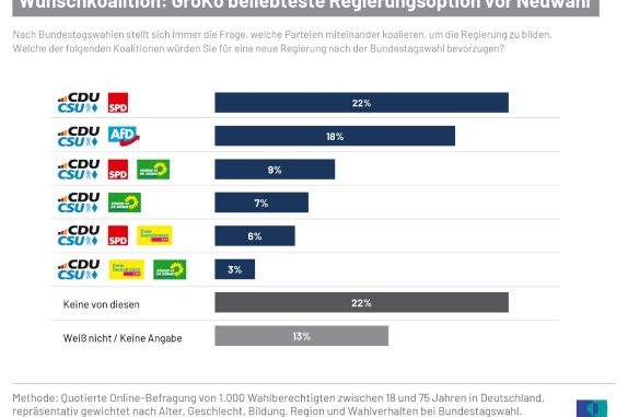 Neben der Kanzlerfrage hatte Ipsos die Wahlberechtigten auch gefragt, welche Koalition sie sich für die neue Regierung nach der Bundestagswahl wünschen. Dabei gaben 22 Prozent der Befragten an, eine Große Koalition aus CDU/CSU und SPD zu bevorzugen. Eine schwarz-grüne Koalition wird dagegen nur von 7 Prozent der Deutschen favorisiert. Ebenfalls nur eine Minderheit wünscht sich eine schwarz-rot-grüne Kenia-Koalition (9%), eine schwarz-rot-gelbe Deutschland-Koalition (6%) oder eine schwarz-gelb-grüne Jamaika-Koalition (3%).
