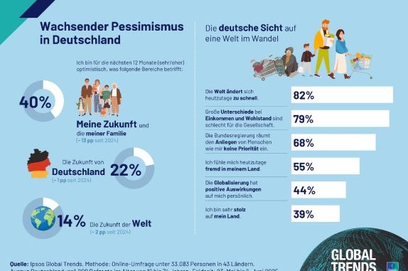 Dies sind die Ergebnisse der Ipsos-Studie Global Trends. Für die neunte Ausgabe dieser Studie wurden zwischen dem 23. Mai und dem 6. Juni 2025 insgesamt 33.083 Personen in 43 Ländern über die Online-Plattform „Global Advisor“ befragt. In Deutschland waren die Befragten zwischen 16 und 74 Jahre alt, die Stichprobe umfasste rund 1.000 Personen.