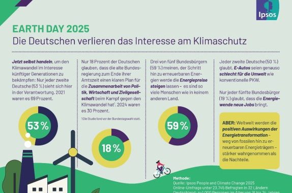 Dies sind die Ergebnisse der Studie „People and Climate Change: Public attitudes to the Climate Crisis and the transition to Net Zero“, die von Ipsos auf der Online-Plattform Global Advisor in 32 Ländern durchgeführt wurde. Für die Online-Umfrage wurden zwischen dem 24. Januar und dem 7. Februar 2025 insgesamt 23.765 Personen befragt. In Deutschland waren die Befragten zwischen 16 und 74 Jahre alt, die Stichprobe umfasste rund 1.000 Personen.