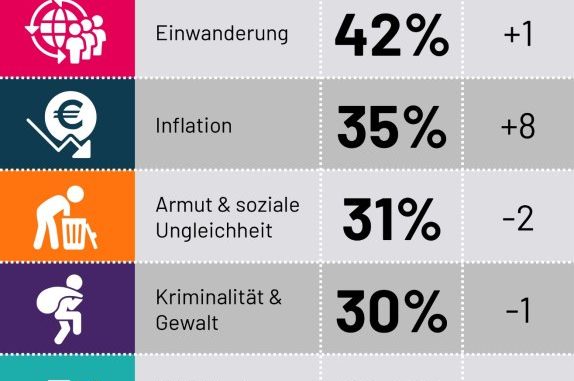 Das Thema Zuwanderung steht im April zum siebten Mal in Folge an der Spitze des Sorgenbarometers in Deutschland: Für 42 Prozent der Bundesbürger gehört sie zu den Themen, die ihnen am meisten Sorgen bereiten. Das ist der höchste Wert in ganz Europa, erst mit großem Abstand folgen Großbritannien (33 %), die Niederlande (28 %), Frankreich (26 %), Polen und Spanien (je 24 %). Im weltweiten Vergleich ist die Sorge um Migration nur in Chile (47 %) noch ausgeprägter.