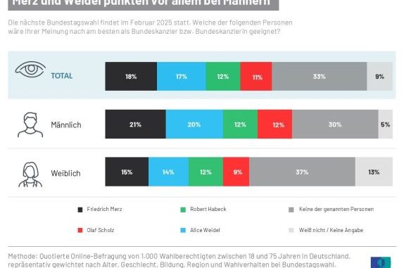 Unionskandidat Friedrich Merz überzeugt vor allem die männliche Wählerschaft. 21 Prozent der Männer halten ihn für den geeignetsten Kandidaten. Bei den weiblichen Wählerinnen kann er dagegen nur 15 Prozent für sich gewinnen. Ein ähnliches Bild zeigt sich bei Alice Weidel: Auch die Bundessprecherin der AfD kommt bei Männern besser an als bei Frauen. Während 20 Prozent der männlichen Befragten sie für die geeignetste Kandidatin halten, sind nur 14 Prozent der Frauen dieser Meinung. Bundeskanzler Olaf Scholz überzeugt 12 Prozent der Männer und 9 Prozent der Frauen, bei Robert Habeck gibt es mit jeweils 12 Prozent Zustimmung keine geschlechtsspezifischen Unterschiede.