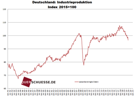 Die Industrieproduktion in Deutschland bricht seit 2018 kontinuierlich ein. Die Entwicklung beim saisonbereinigten Output der breit gefassten Industrieproduktion (Bergbau, Energieversorgung und Verarbeitendes Gewerbe) ohne Baugewerbe ist seit knapp zwei Jahren Rückläufig und es besteht keinerlei Aussicht auf Besserung.