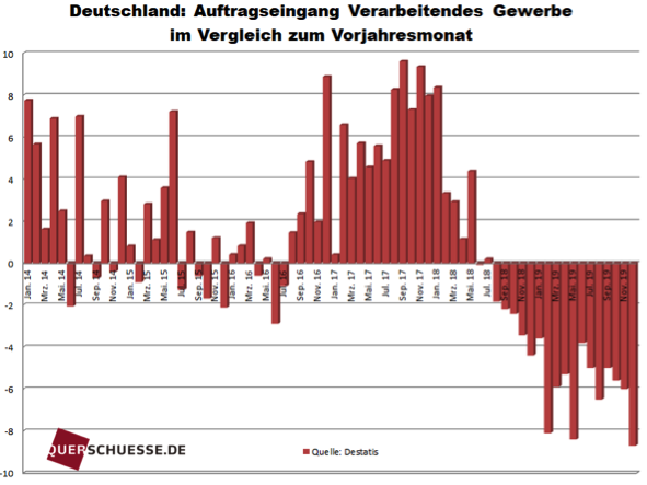 In Punkto Auftragseingänge sieht es bei der deutschen Industrie besorgniserregend aus. Der saisonbereinigte und reale Auftragseingang der deutschen Industrie sinkt seit August 2019.