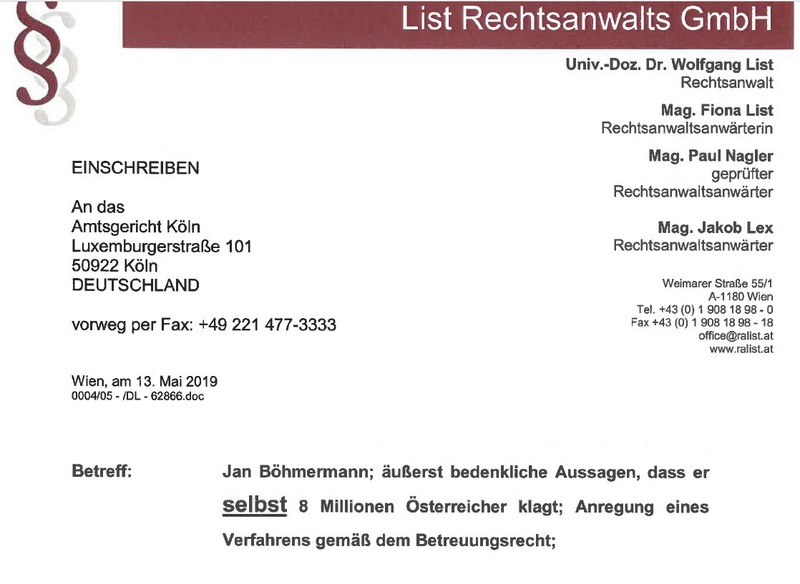 Wiener Anwalts Wolfgang List, der beim Amtsgericht Köln eingereicht wurde,