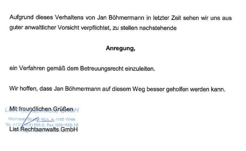 liegt uns jetzt vor. Demnach solle Jan Böhmermann geholfen werden. In seinem Schreiben betonte Anwalt List: