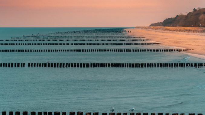 Dann fuhren wir zurück nach Zingst und gingen bei EDEKA einkaufen. Dieser Supermarkt hat wegen der Touristen auch sonntags geöffnet. Es gab Gravensteiner Äpfel, die wir auch in unserem Rodacher Garten hatten, und die Wochenzeitung DIE ZEIT zu kaufen. Anschließend waren wir in einem Café Softeis essen. Dort standen zur Zier Dutzende von Kaffeekannen in den Regalen. Abendessen gab es in unserem Ferienhaus. In der Abenddämmerung gingen wir an den Strand, da mussten wir nur den Deich überqueren, auf dem tagsüber Hunderte von Radfahrern entlangfuhren, in beiden Richtungen. Wir wunderten uns über rote Lampen im Watt, die immer wieder aufleuchteten, und kamen dann dahinter, dass es Windräder sein müssten.