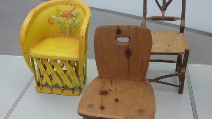 Am meisten Anziehungskraft haben die Unikate wie Rudolf Botts „Kinderhochstuhl“ aus Kiefernholz von 1994 oder ein anonymer dunkler schmaler Lehnstuhl aus afrikanischem Holz, über dessen Entstehungszeit, -ort und –umstände die Sammlerin nichts in Erfahrung brachte. Roger Martens` grünes, leichtgewichtiges Gartensitzmöbel „Trotter“ von 2014 wird in Italien in Serie produziert. Aus kunststoffbeschichtetem Karton besteht Peter Murdochs Kinderstuhl „Spotty“ von 1963. In Mexiko malt man, wie sich selber, seine Häuser oder Wände, so auch die Kinderstühlchen an – und wenn, dann grellgelb und mit einem Vogel drauf. Einfach schön. Einfach und schön.