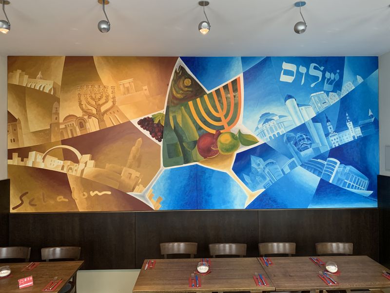 Ein Hauch von Israel, dazu viele jüdische Speisen und ein weltoffenes Klima – auf diese Melange trifft der Besucher, sobald er das Restaurant SCHALOM in der Chemnitzer Heinrich-Zille-Straße 15 betreten und seine Garderobe am Eingang abgegeben hat. Ab 2025 wird Chemnitz den Titel „Kulturhauptstadt Europas“ tragen. Der Duft nach gutem Essen vermischt sich im SCHALOM auch an diesem Herbsttag mit den warmen Farben von dunklem Eichenholz und dem – dank hoher Decken – nie zu lauten, niemals unangenehmen Vielstimmenklang der Gäste. Ein wandfüllendes, expressionistisch anmutendes Wandgemälde in Blau- und Orangetönen mit Motiven aus dem Heiligen Land und Chemnitz zieht die Blicke auf sich, derweil der Besucher die Atmosphäre des Raumes verändern kann, bloß indem er ihn betritt.