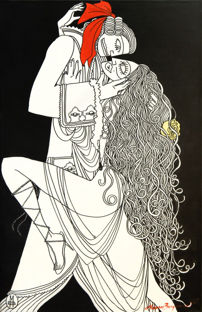 Das ewig verliebte Paar strahlt. Schon Marc Aurel wusste: „Die Seele hat die Farbe deiner Gedanken.“ Bergonzolis Weltenseele zeigt ein Fest der Sinne und der Lust. Die allzu menschliche und tief verwurzelte Sehnsucht nach „sich erkennen und zeigen“. Schon ist die ewige philosophische Frage nach Wahrheit und Dauer jeder Selbstvergewisserung im Raum! Dieser Künstler strebt nach Vollkommenheit, Schönheit in Vollendung. Um sie zu erreichen, sind alle Mittel recht! Das gilt für einen Schriftsteller wie Musiker, und natürlich den Maler im besonderen. Denken wir an die ganze italienische Malerei von Masaccio bis heute, sie strebt immer nach der Verwirklichung dieser Schönheit. Bergonzoli ist überzeugt, die Verwirklichung eines vollständigen und vollkommenen Gleichgewichts ist Ziel aller großen Künstler. Schönheit als das bedeutendste, das glaubwürdigste und verständlichste Vehikel, mit dem man das Publikum zur Wahrheit führt. Das trifft immer ins Herz. Allein Bergonzolis Sonnenuntergänge. In seinen so feurigen wie sanft-orange-rot-rosa-lila-getauchten Markusplatz oder die Erotik der Rassepferde in ihrem Tanz, wenn sie ihre Akt-Beauties ins lodernde feuerrote Abendlicht galoppieren.