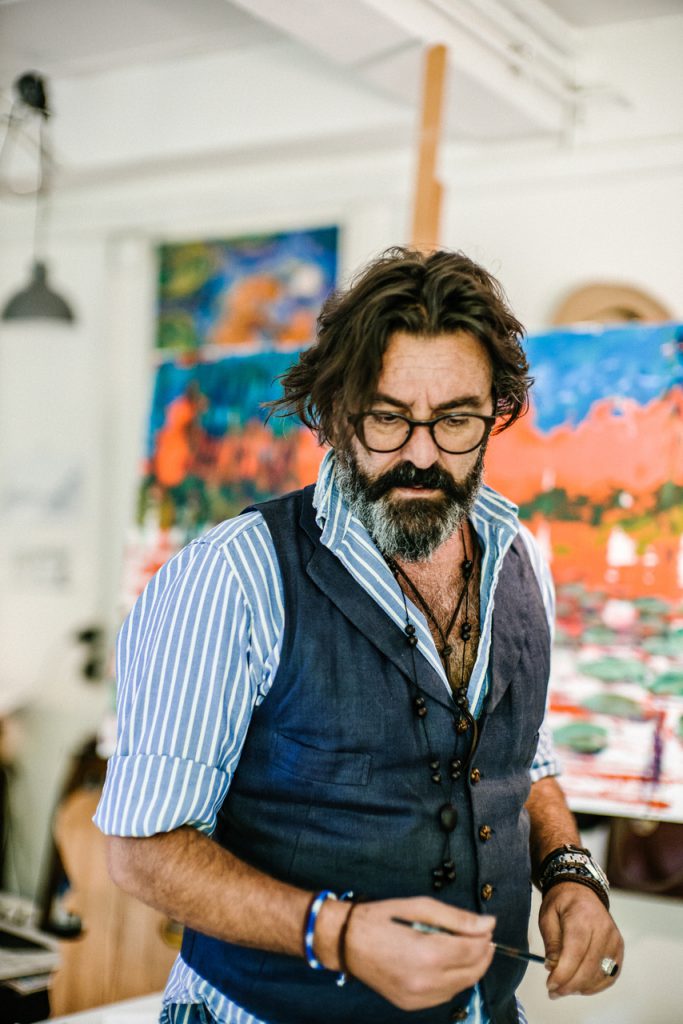 Verliebt blickt Mauro Bergonzoli auf seine Frau Franziska. Beide turteln wie Verliebte! Seine geliebte Muse, Managerin wie ordnender liebevoller Fels in seinen endlosen Schaffensperioden. Seine Schönste, seine Inspiration, Aphrodite und Freundin und die Liebe assoluta ist Franziska Gräfin Fugger von Babenhausen. Spürbarer Magnetismus zwischen beiden. Die Funken sprühen. „Jeder Gedanke, jedes Spiel mit unseren Töchtern Blue Aurora und Victoria, unsere Familienrituale auf dem Land, … alles ist Malerei. Nichts passiert zufällig. Die Gedanken, die wir denken, die Gefühle, die wir fühlen, sind viel mehr als zufällige und vergängliche Moment-Aufnahmen unseres Bewusstseins. Sie machen uns zu dem, was wir sind. Gedanken, die wir immer wieder denken, formen unseren Charakter. Gefühle, die wir immer wieder fühlen, beeinflussen unsere Seele.“ Davon bin ich nach Bergonzolis inspirierenden Werkschauen überzeugt. „Der Geist formt die Materie. Und: Es passiert nicht zufällig, dass wir uns manchmal in einer Gedanken-Spirale mit einem perpetuumartigen Gefühl befinden. Bergonzolis Kunst kann Gedanken sogar fliegen lassen…