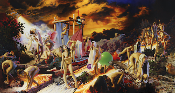 Der Komposition „Une journée horizontale“ liegt unübersehbar Théodore Géricaults Floß der Medusa (1819) im Louvre in Paris zugrunde. Nguyens Bühnenraum ist allerdings im Verhältnis etwas breiter. Anstelle einer eingestürzten Pyramide erkennt man deren zwei. Sie ordnen das gedrängte Tableau von 28 Figuren, jungen Frauen und Männern, die im Einzelnen zu beschreiben hier zu weit führen würde. Nur so viel: Jede scheint eine Welt für sich darzustellen. Jede wirkt halb ferngesteuert in eine Pose gezwungen, halb narzissenhaft hauptsächlich mit sich selbst beschäftigt. Alle sehen sie europäisch aus, was letzteres aber den Modellen geschuldet sein mag, mit denen der Künstler zu arbeiten gewohnt ist.
