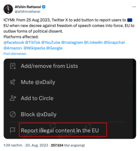 Die betroffenen Unternehmen müssen also künftig Hassrede und Fake News noch aktiver bekämpfen. Illegale Inhalte müssen sofort gelöscht werden. Es muss den Nutzern ermöglicht werden, dass Inhalte auch direkt bei der EU gemeldet werden können. Bei Twitter, heute X, sieht das Ganze dann so wie in dem nachfolgenden Tweet aus. Man hat also einen neuen Button hinzugefügt, wo jeder Nutzer Inhalte melden kann.