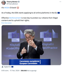 Was schädlich ist, das bestimmt u.a. planwirtschaftlich der nicht demokratisch legitimierte EU-Kommissar Thierry Breton, der den Digital Services Act als großen Schritt in Richtung Schutz der Bürger feierte.
