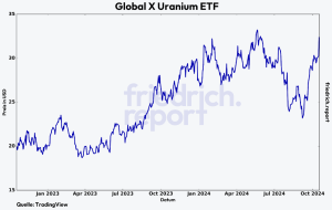 Vor allem die Ankündigungen von Microsoft und Google haben in den letzten Wochen erneut für neue Euphorie bei Uran-Werten gesorgt. So konnte zum Beispiel der größte Uran-ETF, der Global Uranium ETF, allein seit Anfang August mehr als 40 Prozent zulegen. Das ist für ein solches Schwergewicht bemerkenswert. Eine Verschnaufpause erscheint hier erstmal überfällig. Mittel- bis langfristig ist der gesamte Uran-Sektor allerdings sehr interessant.