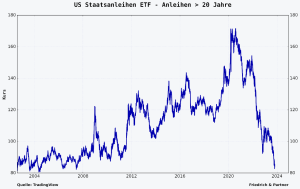 Was wir gerade am Anleihemarkt erleben, ist zweifelsohne ein historischer Einbruch. Über Jahre hinweg haben die Notenbanken die Zinsen immer weiter abgesenkt und durch Quantitative Easing (lockere Geldpolitik), gigantische Summen Geld in den Markt gepumpt. Dadurch hat sich am Anleihemarkt eine gigantische Blase gebildet, die nun die Luft ablässt. Besonders deutlich erkennt man das am Chartverlauf des TLT-ETFs (siehe Abbildung). Dieser beinhaltet langlaufende US-Staatsanleihen mit einer Laufzeit von mehr als 20 Jahren. Mitte 2020 hatte der ETF ein Hoch bei rund 170 Dollar erreicht. Danach ging es steil bergab bis auf rund 85 Dollar. Ein Kursverlust von sage und schreibe 50 Prozent. Und das auf vermeintlich sicheren US-Staatsanleihen, die eigentlich so gut wie Geld sind und zudem als risikolos gelten.