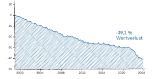 Deutschland ist gerade dabei das härteste Gut aller Zeiten zu verkaufen und erhält dafür Euros, die jedes Jahr weiter an Wert verlieren. Allein seit Einführung hat der Euro fast 40 Prozent an Kaufkraft verloren (siehe Abbildung) und diese Entwicklung wird sich mit hoher Wahrscheinlichkeit weiter fortsetzen.