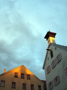 Ab dem 27. Juli bis zum 24. August wird hier und an einigen anderen Orten der Stadt dann die „Große Kunstausstellung“ des Vereins präsentiert. 200 Künstler und Künstlerinnen, die ganz große Kunst-Sause im kleinen Städtchen. Wir finden auch hier in Wasserburg die so typische Inn-Salzach-Bauweise der Bürgerhäuser mit ihren Schein-Fassaden vor dem von vorne unsichtbaren Dach wieder. Die ganze Inn-Region bis nach Österreich ist geprägt von diesen eindrucksvollen Häusern, die mit hellen, freundlichen Farben verputzt sind.