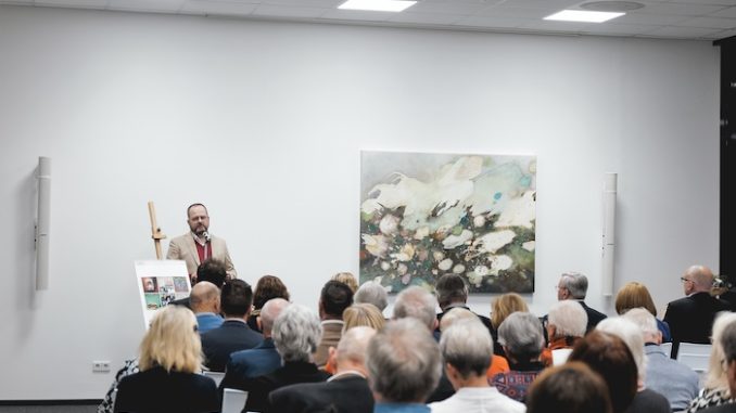 Die große Dezember-Vernissage in der LAUDA FabrikGalerie ist ein Glanzlicht der Kulturregion. Und so kamen auch diesmal wieder etwa 90 Gäste trotz des widrigen Wetters, um die schon 160. Ausstellung feierlich zu eröffnen. Die Vernissage im Dezember ist traditionell auch der Anlass, den neuen Kunstkalender vorzustellen, der die Ausstellungen des Jahres 2024 würdigt und zum Selbstkostenpreis angeboten wird. Der Erlös wird für einen wohltätigen Zweck gespendet.
