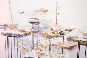 Es entstehen mit Papier ummantelte Quader oder vor allem auch Boote mit Segeln und Leitern. Symbolhafte, poetische Formen, neue Welten, zu allen Seiten offen, sich mit der Welt verbindend, die uns umgibt. Aber auch eben auch „losgelöst“ von der Welt, wie der Titel der Ausstellung andeutet. Die Ausstellung ist bis zum 4. Februar nach Anmeldung für die Öffentlichkeit zugänglich.