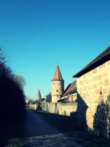 Die kleine Stadt liegt inmitten einer leicht gewellten Hügellandschaft in der Altmühl-Mönchswald-Region, zu der auch die Gemeinden Merkendorf, Mitteleschenbach, Ornbau und Weidenbach gehören. Merkendorf und Ornbau lohnen unbedingt einen Besuch! Auch hier: mittelalterliche Ortskerne hinter dicken Stadtmauern. Gleich steigen wir auf unsere Räder – und wir haben Glück, das Wetter spielt schon jetzt, Anfang März, perfekt mit. Wir radeln eine kleine Acht über wenig befahrene Landsträßchen und Wirtschaftswege, um die beiden Städtchen zu besichtigen: Von Wolframs-Eschenbach über Waizendorf nach Merkendorf, weiter über Heglau und Hirschbach nach Ornbau, zurück über Neuses und Biederbach.