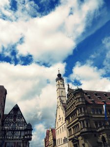 Und dann, endlich, Rothenburg ob der Tauber. Der Name klingt, bis heute. Aber es ist schwierig, über die Stadt zu schreiben. Denn so viel wurde schon über sie gesagt. „Eine Stadt, deren Gesicht auf eine Postkarte gepresst wurde“, so Hans Dieter Schmidt in seinem sehr lesenswerten Taubertal-Buch „Melusine und schwarze Wasser“. Oder der bedeutende Kunsthistoriker Georg Dehio: Die Stadt sei „als Ganzes ein Kunstwerk“ schreibt er. Und Herbert Schindler in seinem Buch über die Romantische Straße, an der Rothenburg liegt: Man fände hier „reines, großes Mittelalter“. Oder, noch besser, Rothenburg, das sei schlichtweg die „Lieblingsstadt der Welt“.