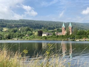Auch machen wir Station am Kloster Neustadt, zwischen Lohr und Marktheidenfeld. Das Kloster mit seiner Basilika, heute in großen Teilen neuromanisch, soll schon im 8. Jahrhundert gegründet worden sein. Es ist ein stiller Ort und einer der bedeutenden frühmittelalterlichen Kristallisationspunkte des Spessarts. 2023 haben die Dominikanerinnen das Kloster verlassen – Klosterhof und das Gelände sind aber zugänglich.