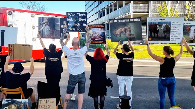 Mit 29 Aktivist:innen haben wir unsere 42. Mahnwache am Skandal Schlachthof Aschaffenburg abgehalten. Es wurden auffällig weniger Tiere angeliefert, ausschließlich Schweine. Während es üblicherweise zwischen 20-25 Transporter sind, waren es gestern während unserer Mahnwache ’nur‘ 15 Trucks. Auffällig war auch, daß keine Rinder wie üblich angeliefert wurden.