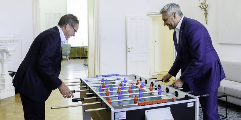 Kanzler Karl Nehammer (rechts) mit Ralf Rangnick beim Tischfußball im Kanzleramt am 16. Mai. (Foto: Bundeskanzleramt)