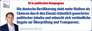 Die deutsche Bevölkerung begegnet dem Einsatz von generativer Künstlicher Intelligenz (KI) im Wahlkampf mit großer Skepsis und Sorge: Über 50 Prozent bewerten KI-Inhalte in politischen Kampagnen als gefährlich, eine große Mehrheit fordert Kennzeichnungspflichten (83%) sowie eine Überprüfung künstlich erzeugter Inhalte durch unabhängige Expert*innen (75%). Zugleich unterscheiden sich KI-generierte Bilder in ihrer Wirkung kaum von echten Fotografien: In beiden Fällen sind die Inhalte der Botschaft ausschlaggebend für die Wahrnehmung der Rezipient*innen. Die rasante Entwicklung der KI-Modelle erweitert entsprechend die Möglichkeiten bestehender politischer Kampagnenarbeit, verändert aber nicht die grundlegende Wirkungsweise politischer Kommunikation. Das sind zentrale Ergebnisse der Studie „Künstliche Intelligenz in politischen Kampagnen“, die die Otto Brenner Stiftung heute veröffentlicht hat.