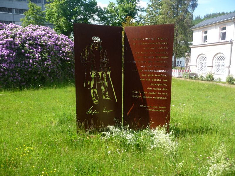 P1070741 Schwarzenberg im Erzgebirge, Schauplatz von Stefan Heyms bekanntestem, gleichnamigen Roman und wo man ihm vor dem Rathaus ein Denkmal errichtet hat. Fotos: Vallendar Drucken