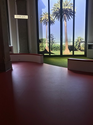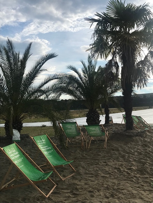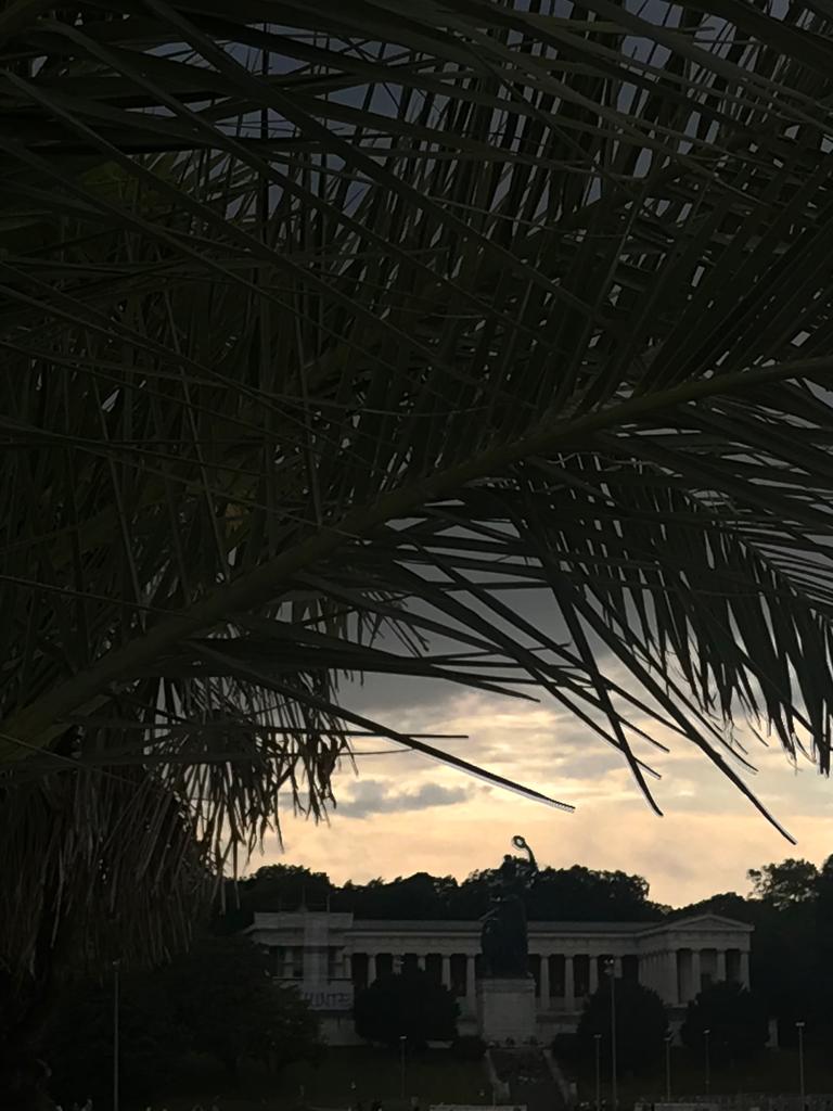 Stattdessen ein Wohlfühlgefühl, das uns eintauchen lässt in eine zeitlose Welt voller sinnlicher Erlebnisse, die uns Flügel verleihen, ohne Mund- und Nasenschutz Menschen und Tiere zu umarmen, Bilder wie Nektar aufzusaugen und deren aphrodisierende Wirkung als Energieträger zu inhalieren. Und wenn diese Palmen nicht erst in einer Expedition erforscht und mühsam in die Heimat transportiert werden müssen, sondern einfach so in der Nähe erreichbar sind, dann ist das ein geniales Werk der Mutter Bavaria. Als Wahrzeichen Münchens auf der Theresienwiese weltweit bekannt und beliebt, ist diese kolossale Bronzefigur zu neuem Leben erwacht. Wer hätte gedacht, daß die Bavaria mit dem Kranz in ihrer erhobenen linken Hand dieses Jahr nicht über das Oktoberfest wacht, sondern ebenso volkstümlich Palmen zu ihren Füssen wachsen lässt, einen Strand mit Liegestühlen zur Entspannung und Kommunikation schafft, sportliche Klimmzüge an Stangengerüsten Menschen jeden Alters zum Spaß oder Training bietet und die Ruhmeshalle im Blick der Palmen eine menschlichere Dimension erhält.