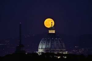 ROM, BLICKE – so der verheißungsvolle Titel – verbindet zwei unterschiedliche Medien – Fotografie und Malerei – auf ungewöhnlicher Art und bietet gleichzeitig Anlass zu erneuter Reflexion über die Ewige Stadt. Die Fotos stammen vom Christof Kirzinger, der seit 2012 in Rom lebt, nämlich seit seinem Studium der Architektur. Und Architektur im „Kontext mit Mensch und Natur“ ist das Hauptthema einer Reihe, die verschiedene Perspektiven eröffnet. Mal ist der Kontrast zwischen Antike und Moderne, zwischen feierlichen Stunden und trostlosen Einblicken in eine herunter gekommene Gegend, die den Bauforscher in einer Stadt im stetigen Wandel besticht. Mal rückt der Tagesverlauf in den Mittelpunkt seines Interesses mit suggestiven Sonnen- und Mondaufgängen, die die Denkmäler der Metropole in einzigartigen Veduten verwandeln, sie wie Juwelen in ihrer Einmaligkeit aufwerten und zur Schau stellen. Blicke, die verzaubern wie der rote Mond neben der großen Kuppel vom Petersdom oder ein Blitz, der plötzlich die Dunkelheit erhellt und ungeahnte Kulissen zum Vorschein bringt.