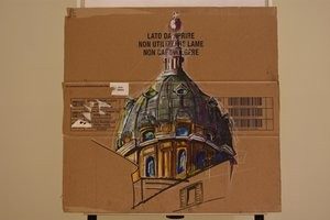 Glanz und Elend Roms finden ihren Niederschlag auch in den Gemälden, die Rachele del Nievo zwischen den Fotos zeigt. Werke mit ambivalentem Charakter, die die Ästhetik des Schönen mit gesellschaftskritischen Ansätzen verbinden. Auf gebrauchten Kartonagen, die noch die Anschriften ihrer Adressaten, Firmenlogos oder Inschriften wie „Öffnungsseite“ tragen, hat die engagierte Rachele del Nevo Motive mit Stiften und Markern eingezeichnet, die sich von Rom inspirieren lassen. Kunstmotive auf Verpackungen, die man sonst wegwirft. „Arte Povera“ einer Street Art-Künstlerin, die zu den zehn übrig gebliebenen gehört, die von der chinesischen Konkurrenz noch nicht verdrängt wurden und ihre Rom-Ansichten immer noch auf der Straße verkaufen. Dort hat sie Kirzinger tatsächlich kennengelernt. Aus der zufälligen Begegnung ist nun eine geglückte Kooperation entstanden, die sogar in die Darstellung gleicher Motiven – wie z.B. die Kuppel von St. Andrea della Vale – gipfelt.