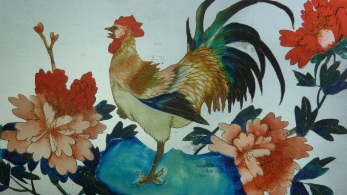 Dem Gockelhahn werden in China seit jeher Mut, Bildung, Belesenheit, Altruismus und Zuverlässigkeit zugeschrieben. Er ist Glücksbringer. 2017 ist übrigens ein Jahr des Hahnes – wie es 2005 war und 2029 sein wird. Er wird gerne mit der Strauchpfingstrose dargestellt, der paeonia suffruticosa (Päonie). Deren Blüte gilt in China als am häufigsten dargestelltes Bild für Wohlhabenheit und hohen gesellschaftlichen Rang. Der Hahn auf dem holzgerahmten Hinterglasbild (Katalog Nr. 16) kräht auf einem Felsen einbeinig stehend. Wer im Schlossmuseum Murnau vor zehn Jahren die Schau „Chinesische Bilder. Volkskunst – Inspiration für den `Blauen Reiter`“ sah, stieß vielleicht auf eine ähnliche Hahn-Darstellung (Foto) wie die hier (aus insgesamt drei verschiedenen) ausgewählte.