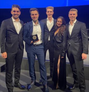 Die Produzent:innen und der Regisseur von ALMOST HOME, bei der Preisverleihung in Los Angeles, mit dem goldenen Student Academy Award in der Hand.